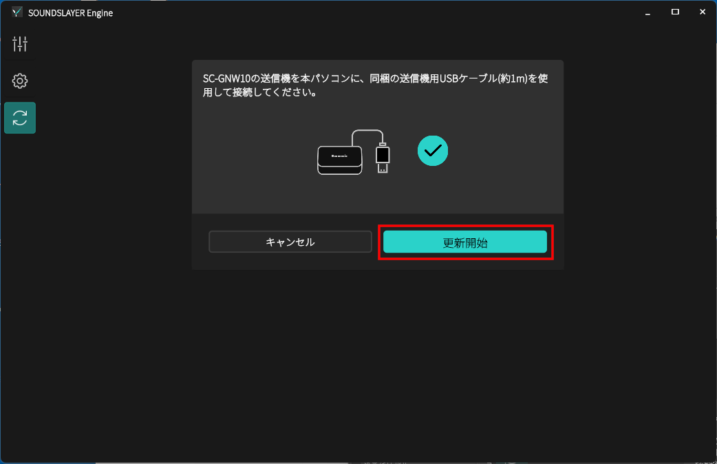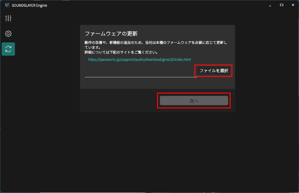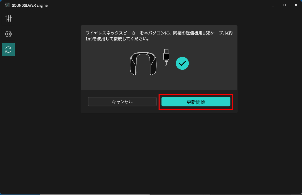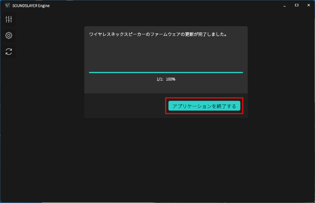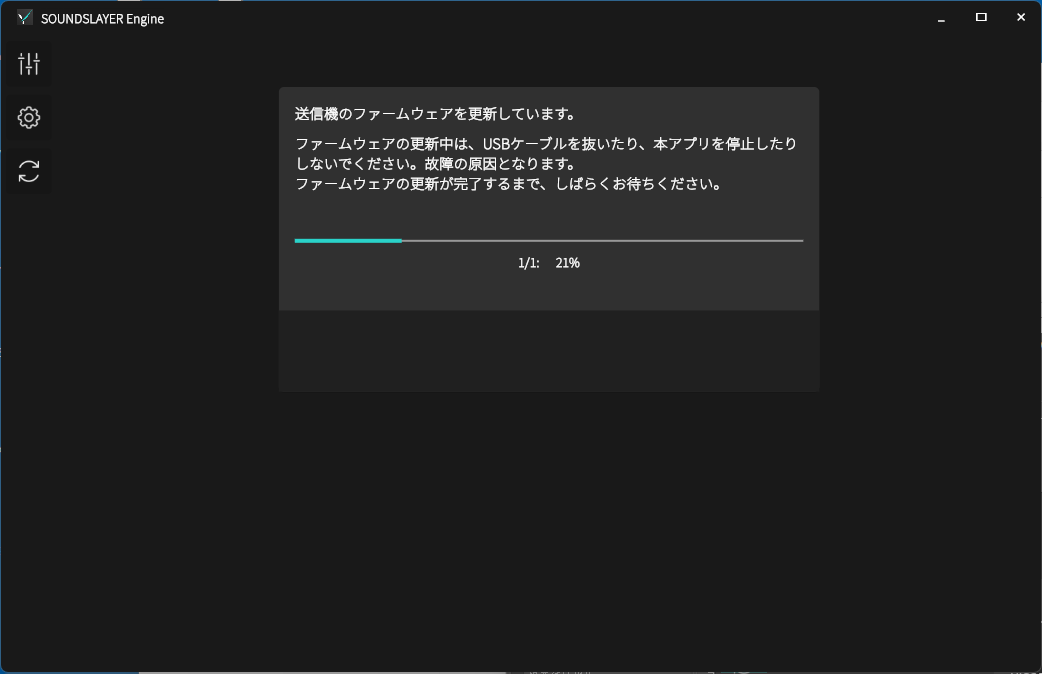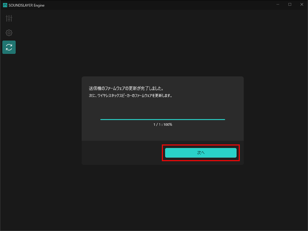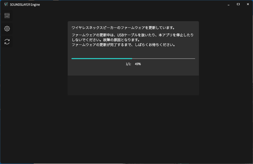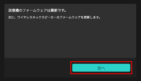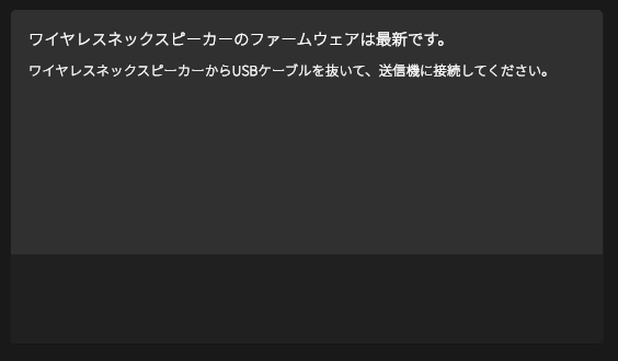 送信機のファームウェア更新が終了した後、続けてワイヤレスネックスピーカーのファームウェア更新が行われます。"SOUNDSLAYER Engine"の画面に従って操作してください。After the transmitter firmware update is complete, the wireless neck speaker firmware update will begin. Please follow the instructions on the "SOUNDSLAYER Engine" screen.