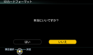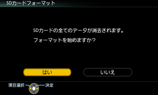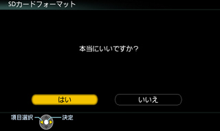 | 4.SDカードフォーマットメニューで、「はい」を選び、リモコンの決定ボタンを押します。 |