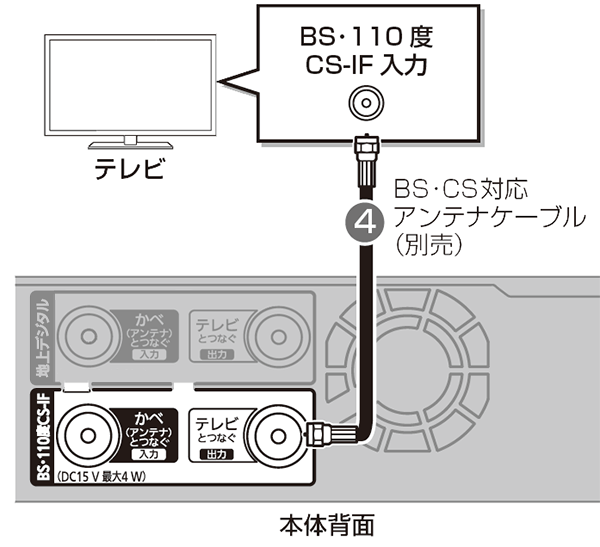 ❹ BS・CS対応アンテナケーブル(別売)をレコーダー本体背面[テレビとつなぐ(出力)] の端子に接続します。
