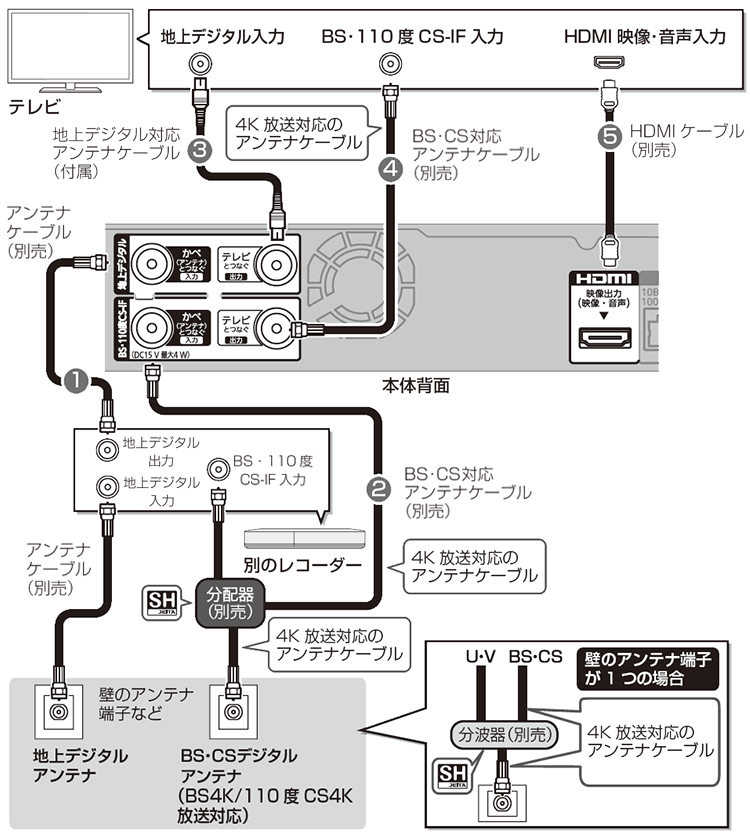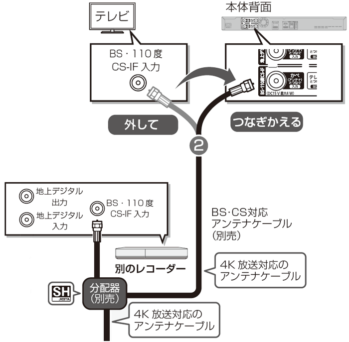 の端子に接続します。❷ 4K放送対応アンテナケーブルをレコーダー本体背面 [かべ(アンテナ)とつなぐ(入力)] の端子に接続します。