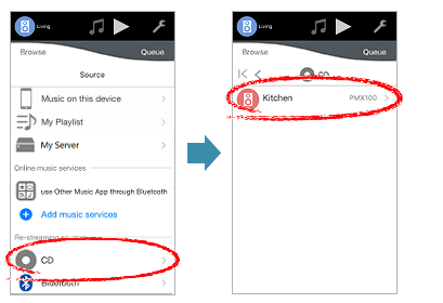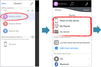 2-1. If you want to play back the song of your iPhone/iPad/iPod touch, tap [Music on this device] on the top of the list.