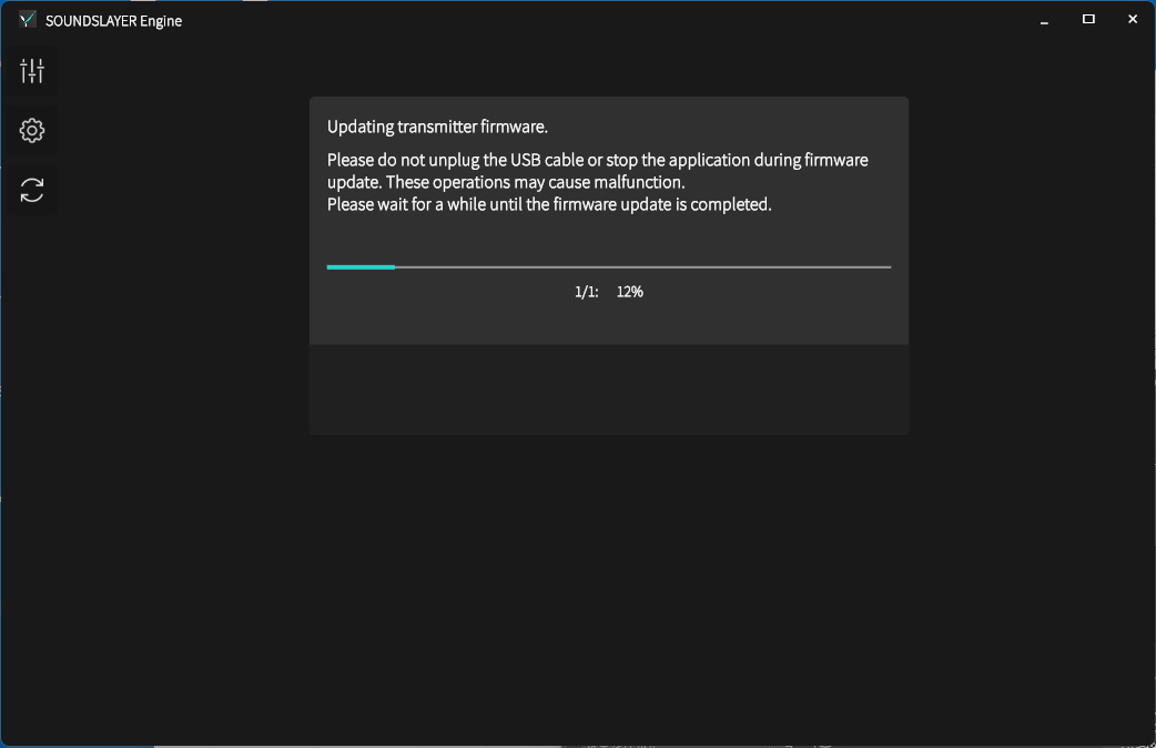 ファームウェア更新中は、ワイヤレスネックスピーカーや送信機の電源を操作したり、アプリを動作させているパソコンなどの端末のリセット、電源を切る操作を行わないでください。During the firmware update, do not operate the power of the wireless neck speaker or transmitter, or reset or turn off the terminal such as the PC running the app.