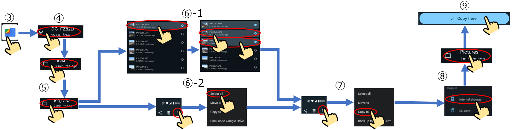 in the upper right corner and select "Copy to". (To delete images in the camera after import, select "Move to".)⑧ After selecting "Internal storage" as the copy destination, select "Pictures".