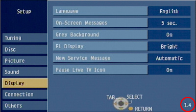 - Press and hold the "STATUS( i ) " button on the remote control. While doing so, the current firmware version for your recorder will be displayed in the lower right hand corner of the screen (e.g. "1.4").