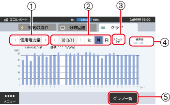 グラフに表示できる期間(エネルギー計測履歴保存期間)は1時間ごとのデータで35日、1日ごとのデータで15か月、1か月ごとのデータで10年です。