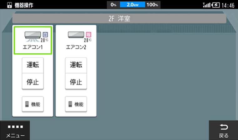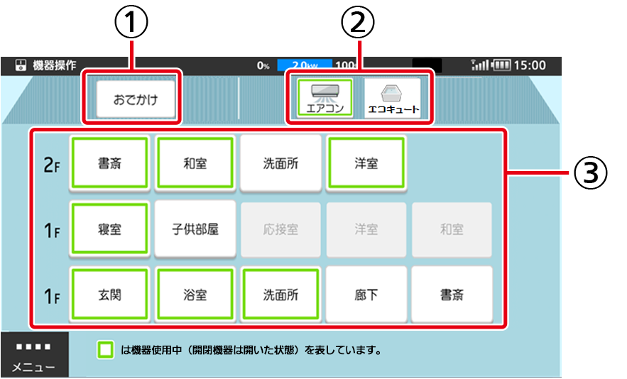 「家電機器設定」の「間取り表示」を「入」にすると、部屋を選んで、機器を操作することができます。