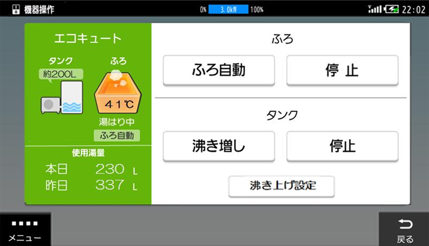 機器操作画面で「エコキュート」を選ぶと操作画面を表示します。 下図は一例です。機種によって表示は異なります。 機能の詳細については、お使いのエコキュートの説明書をお読みください。