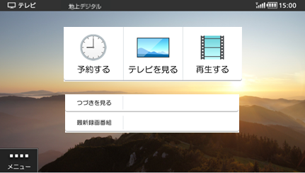 テレビ放送の受信、録画、予約録画を行います。録画した番組の再生や消去もこのメニューで行います。