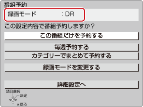 録画モードを変更(変更後、「この番組だけを予約する」または「毎週予約する」を選んで予約を登録してください)