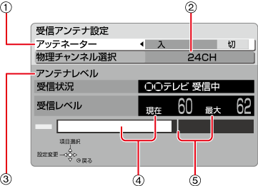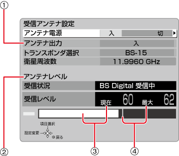 アンテナレベルは、アンテナの設置方向の最適値を確認するための目安であり、チャンネルによって異なります。表示されている数値は、受信している電波の強さではなく質(信号と雑音の比率)を表します。天候、季節、地域やアンテナシステムの条件などにより変動する場合がありますので、十分な余裕をとることをお勧めします。