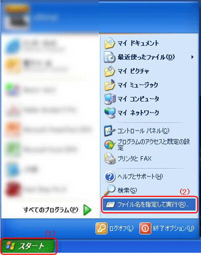 - 「ファイル名を指定して実行(R)..を選択する(下図Iの(2)参照)。