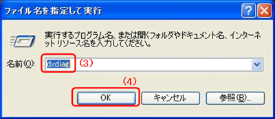 図I - 「ファイル名を指定して実行」の画面で、"dxdiag"と入力して、“OK”ボタンをクリックしてください(下図II(3)(4)参照)。