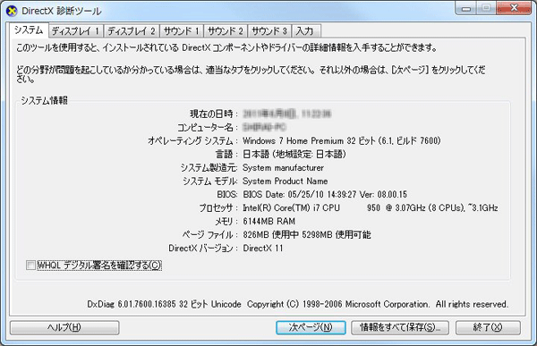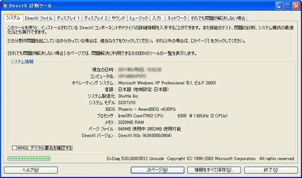 図VI - Direct X 診断ツールが表示されますので、プロセッサ名(CPU)などを確認してください(図VII)