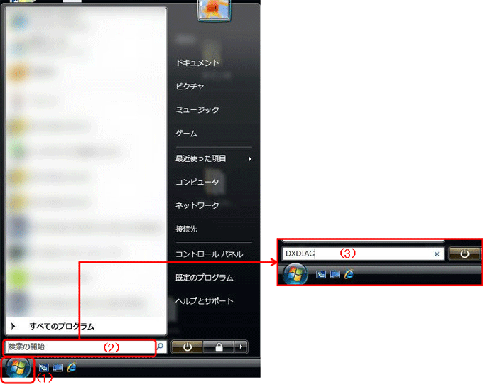 - “検索の開始”と表示されているボックスに、“DXDIAG”と入力して、“Enter”キーを入力してください(下図IVの2)(3)。