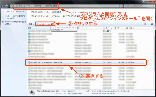 - 「Microsoft .NET Framework 4 Client Profile」を選択して、“アンインストールと変更”ボタンをクリックしてください。(下記図 I 参照)