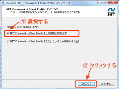 「.NET Framework 4 Client Profileを元の状態に修復します」を選択して、“次へ(N)”ボタンをクリックしてください。(下記図 II 参照)