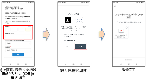 ⑥ ビエラに表示された機器情報を入力して送信し、設定を続けるとテレビが登録されます。