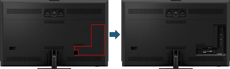 TV-〇〇Z95B, TV-〇〇Z90B のUSB端子は本体背面の端子カバーを外したところにあります。カバーの外し方はTV-〇〇Z95B, TV-〇〇Z90Bの「取扱説明書」 P11 を参考にして外してください