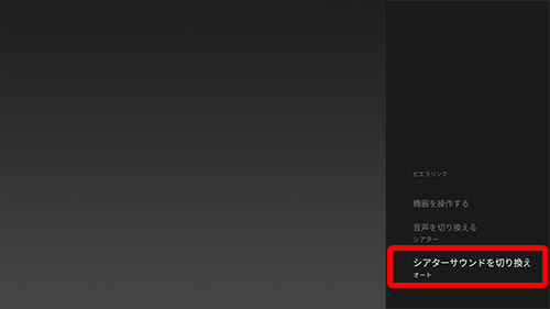 - 表示された画面から、「シアターサウンドを切り替える」を選択し、リモコンの「決定」ボタンを押す。