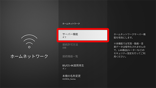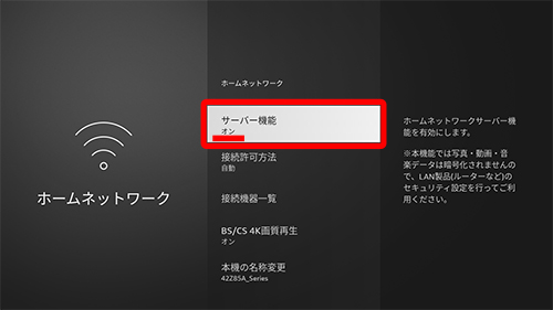 - 「サーバー機能」を選択し、リモコンの「決定」ボタンを押す。