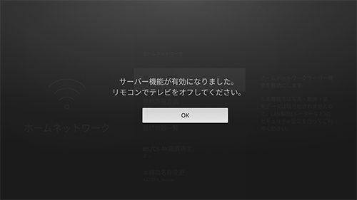- サーバー機能が有効になったメッセージが表示されるので、リモコンの「決定」ボタンを押す。
