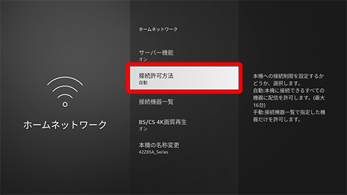 - 「接続許可方法」を選択し、リモコンの「決定」ボタンを押し、「自動」にする。